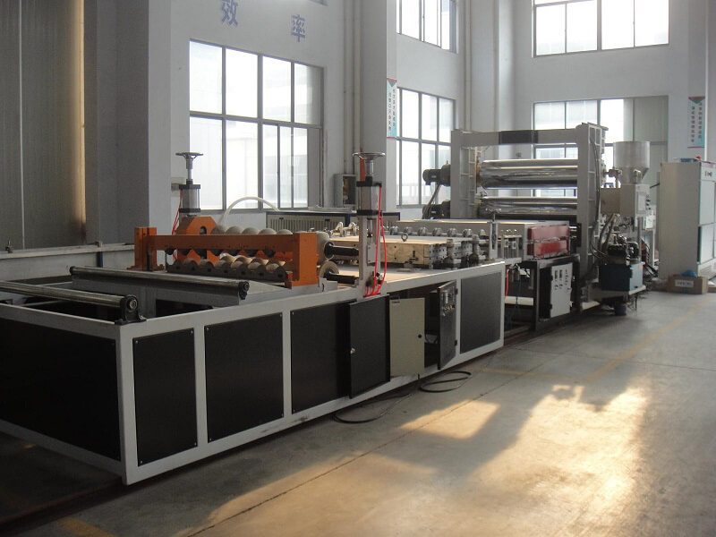PVC corrugated roof tile extrusion line composes of twin conical screws extruder, and corresponding calibrating machine, haul-off and cutting machine.